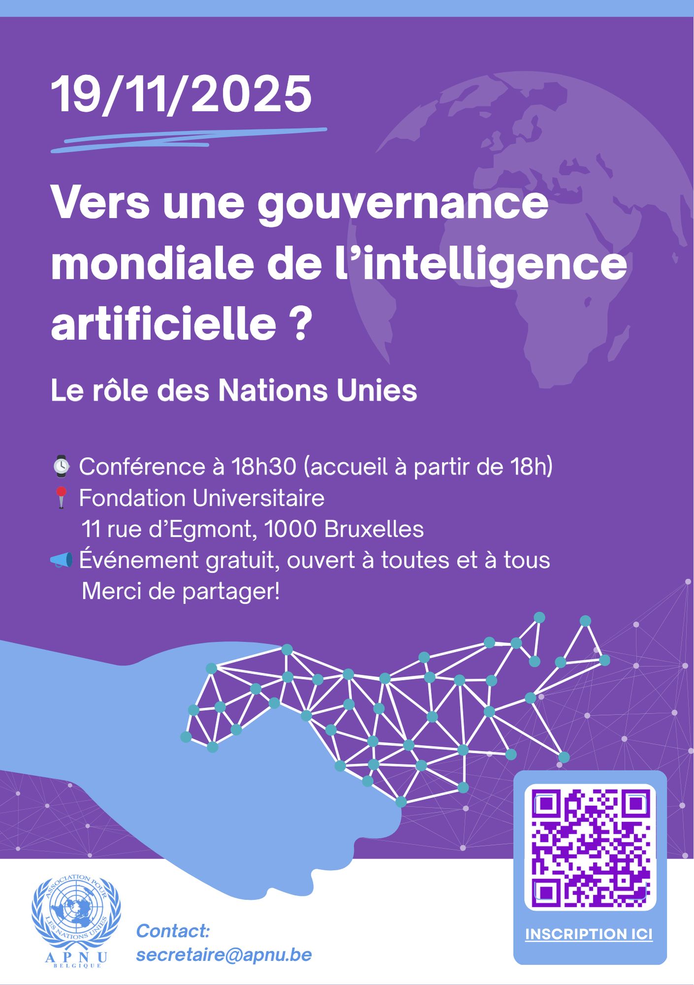 Nous avons le plaisir de vous inviter à notre prochaine conférence-débat sur le thème “Vers une gouvernance mondiale de l’intelligence artificielle? Le rôle des Nations Unies” qui aura lieu le 19 novembre 2025 à 18h30.